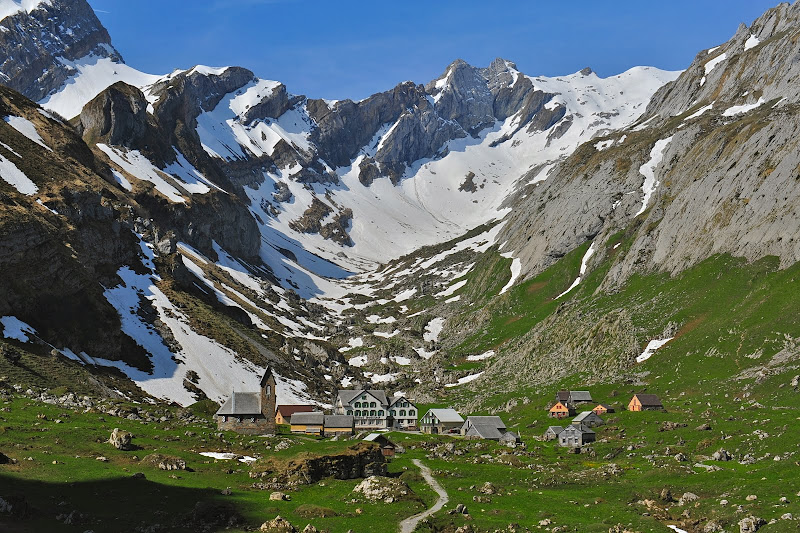 Our next stop was something of a mystery for us before we reached it. From the valley below, Meglisalp didn't seem possible. The map showed a berggasthaus in a spot that looked, from the lower vantage point, to be nothing but cliff. A trail marker led us onward, though, and up a tiny cleft in the rock. We scrambled up a narrow ledge and through a series of dizzying switchbacks, clutching at a cable that was anchored to the sheer mountainside and offered little comfort. At last, after climbing up nearly three hundred feet, we emerged onto a hidden plateau, bordered on three sides by steep ridges and by an unscalable drop on the fourth. Here, hidden completely in the folds of the mountains, was the hamlet of Meglisalp, the entirety of which is shown in the above picture.