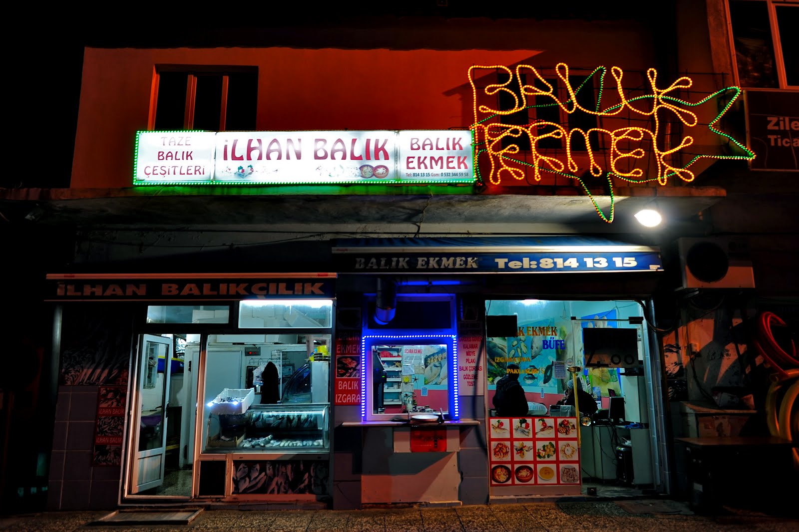 The fishmongers specialize in sardines and anchovies this time of year. Next to this little fish market, attached really, is a kebap joint. It looks like every other kebap place at first, except through the window there is a big bowl of fresh fish instead of a spinning shawarma. The smell of fry, grilled round bread, bowls of shredded lettuce, onion and sliced tomato are all the same but the finished product is decidedly local. The proprietor, popping his head through the to-go window, called us in for 'Balik Ekmek,' translating it literally to "Fish Bread!" It's a sandwich actually, wrapped in immediately grease-spotted paper with little blue and red dolphins on it. We dug right in to our perfect encapsulation of 'Turkish maritime.'