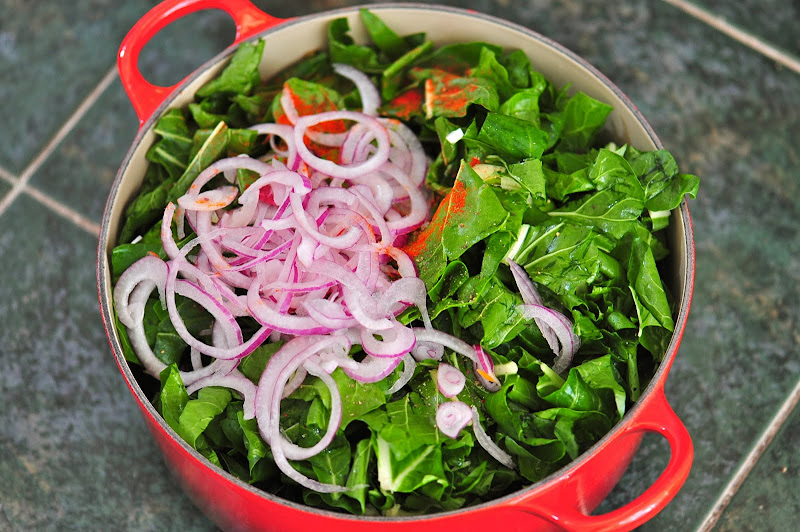 Blitva is a very traditional side dish here and we've had our fair share, which made us more excited to make it. Blitva is the Croatian word for swiss chard (or "mangold," as it is translated on many English menus), but really defines its most common preparation: swiss chard, potato, olive oil and garlic. Cooked down into more of a mash it makes a wonderful dairyless alternative to creamed spinach, but we were craving something a little fresher and lighter for our cookout. So, we used equal parts red potatoes (with skin) and carrot, red onion and forewent the garlic - as it was already incorporated into our main course.